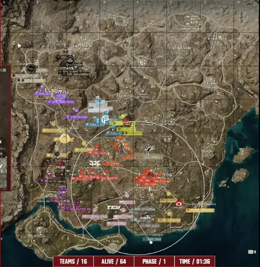 决赛圈四支队伍。PeRo开车向圈内转移,但转移过程中被多队枪线打掉两人,随后4AM利用道具将PeRo最后两人淘汰。
